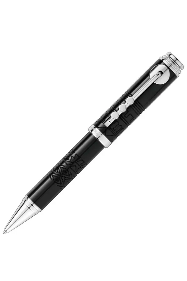 万宝龙伟大人物系列中的迈尔斯-戴维斯 114346 圆珠笔是为了纪念爵士乐小号手迈尔斯-戴维斯。这支重 52.9 克的钢笔整体造型的灵感来自于小号,笔帽上的小号瓣形状的笔夹与小号最为相似。这款书写工具选用优质树脂制成,带有小号瓣的笔夹采用铂金表面处理。