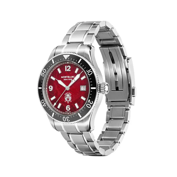 Montblanc Iced Sea Automatic Date 132291 将运动优雅与个性风格完美融合。其 41 毫米圆形不锈钢表壳 配备 醒目的陶瓷表圈,搭配 酒红色纹理表盘,呈现出如冰封湖泊般的视觉效果 —— 此为该系列的标志性设计元素。表盘上配有 3点钟位置的实用日期窗,并由 防刮蓝宝石水晶镜面进行保护。