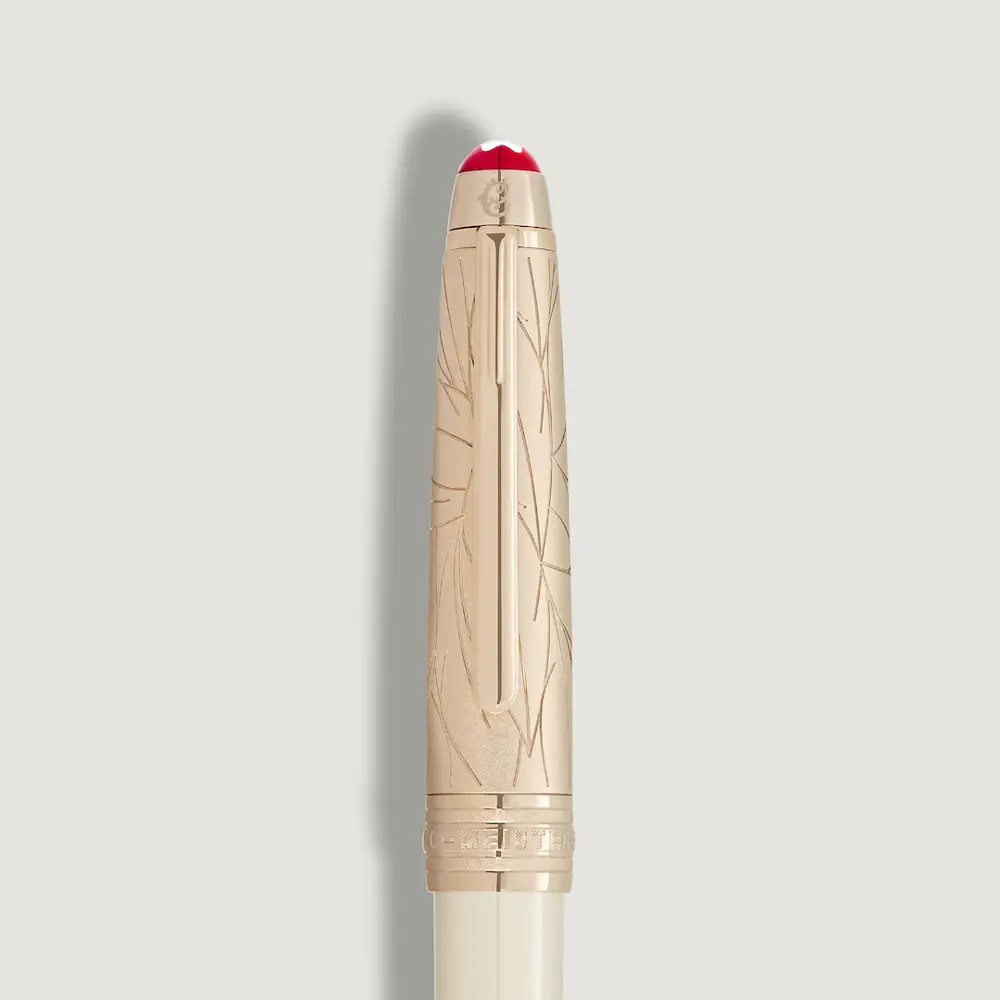 象牙色珍贵树脂笔身表面光滑,握持舒适,外观优雅。镀金金属笔帽饰有灵感源自天使之翼的羽毛雕刻图案,增添独特装饰效果并体现朱丽叶的象征意义。