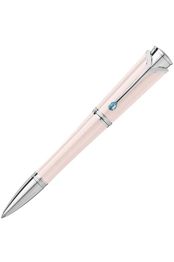 万宝龙 Muses Poudré 女士钢笔由瑞士万宝龙品牌推出,采用流行的粉红色树脂制成。这款笔的设计参考了 20 世纪 50 年代的女性时尚,下垂的肩部和纤细的腰部是其标志性特征。铂金配件上镌刻有摩纳哥皇家徽章的钻石装饰。