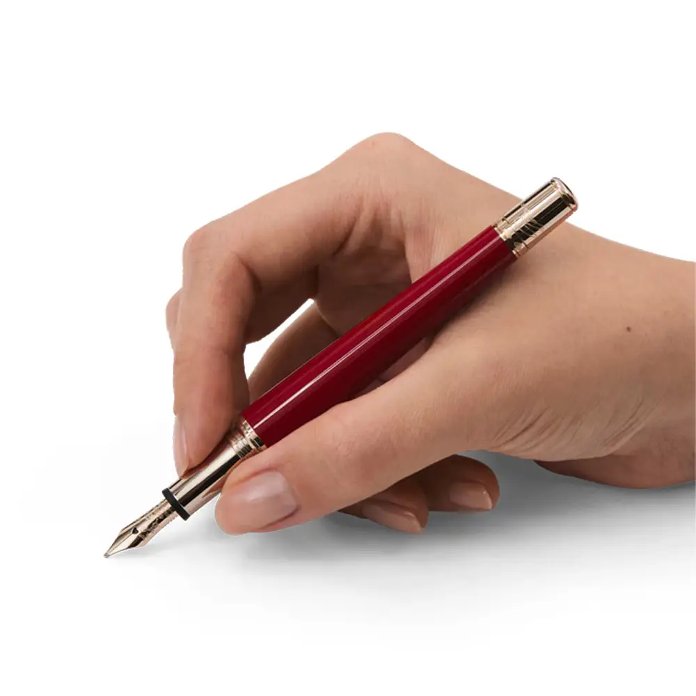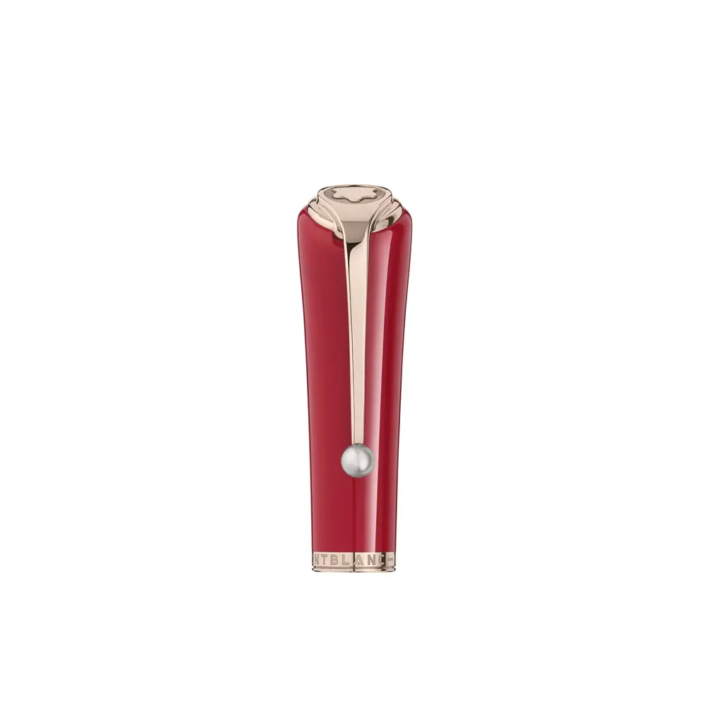 香槟金色镀层笔夹并 镶嵌珍珠,灵感源自她对珠宝的热爱与高雅品味。红色珍贵树脂笔帽配有 Montblanc 浮雕字样,令整体设计更加和谐优雅。