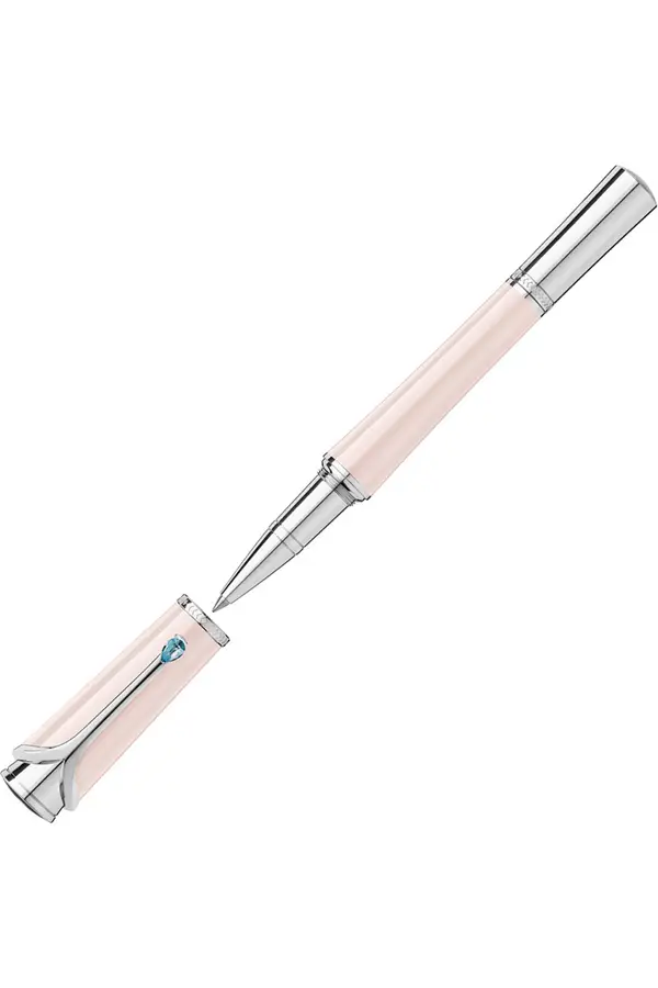 优雅的女士圆珠笔 Montblanc Muses Poudré 115272 是万宝龙的产品。它由粉红色树脂制成。装饰元素上涂有铂金涂层。笔帽上的铂金笔夹装饰有花瓣形状的蓝色立方氧化锆。这款钢笔的设计灵感来自 20 世纪 50 年代的女性时尚。