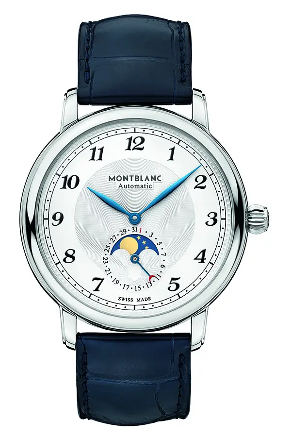 搭配黑色鳄鱼皮表带和折叠扣,佩戴舒适且展现高贵气质。具备3 ATM(30 米)防水性能,适合日常佩戴及正式场合。Montblanc Star Legacy Moonphase 完美结合了经典优雅、制表传统与月相之美的诗意表达。
