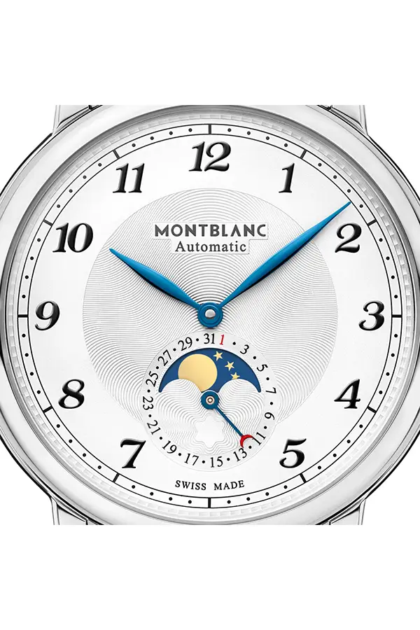 腕表的亮点是白色表盘,饰有精致的机刻饰纹、手工镶贴时标,以及优雅集成在6 点钟位置的月相显示。上方还有一个实用的日期显示窗,增强了日常功能性。内部搭载一枚自动机械机芯,确保精准、流畅的运行,无需手动上链。