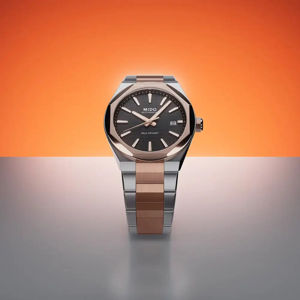 Mido Multifort 8 One Crown 以现代感与建筑美学相融合的设计脱颖而出。标志性的 八角形表圈 与一体式精钢表链(玫瑰金色 PVD 涂层)赋予腕表鲜明个性。黑色纹理表盘呈现出层次与动感,夜光指针与刻度确保清晰易读,兼具运动气质与优雅风范。