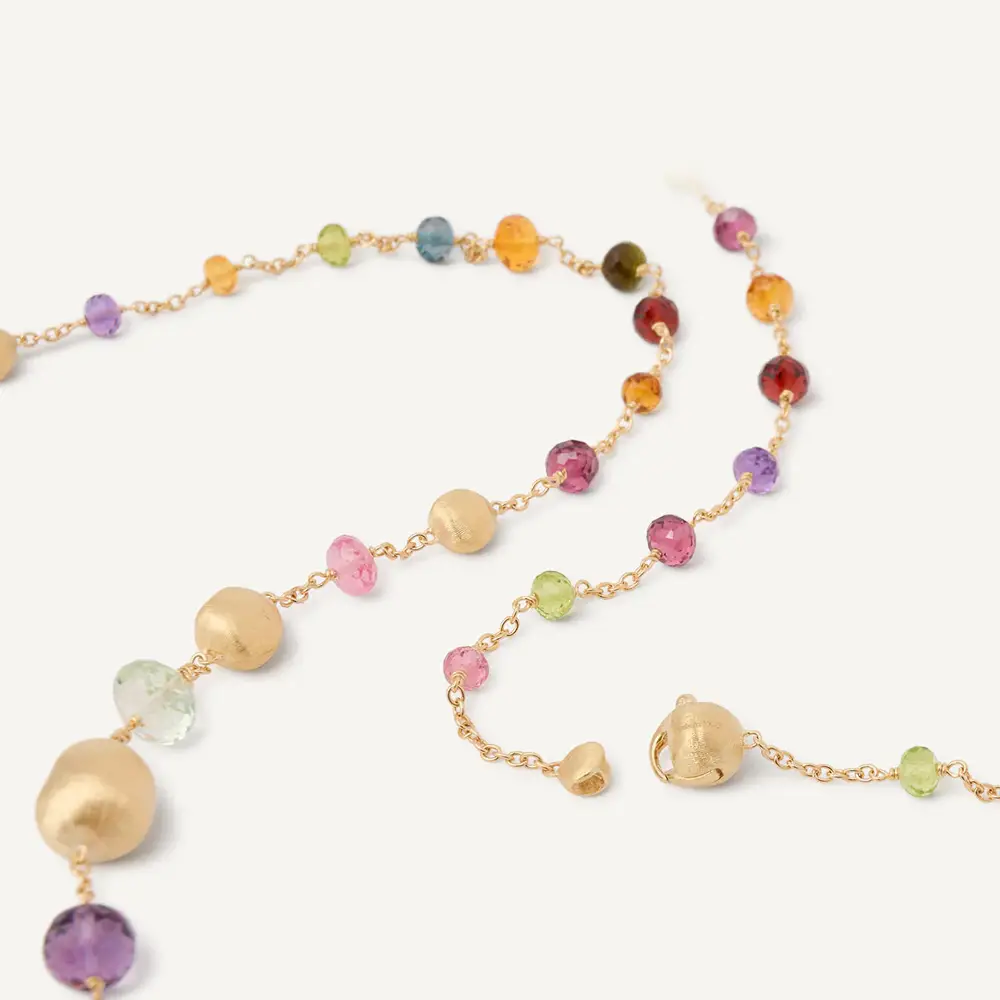 项链镶嵌 多种天然半宝石,以 玫瑰式切割 (Rose Cut) 打造,提升光泽与通透感。色彩缤纷的宝石与金色温润光泽交相辉映,构成和谐的视觉平衡。每颗宝石均由手工镶嵌,保证每件作品的独特与非凡。