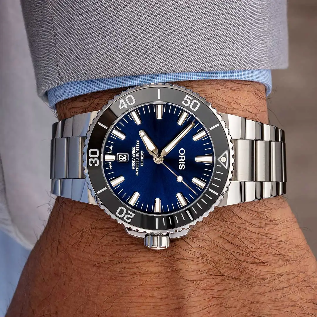 Oris Aquis是该品牌的旗舰潜水系列,集功能性、坚固结构和现代设计于一身。Aquis系列专为真正的水下部署而设计,防水深度达300米,配备旋入式表冠、单向月牙形表耳以及高抗震性和抗压性。