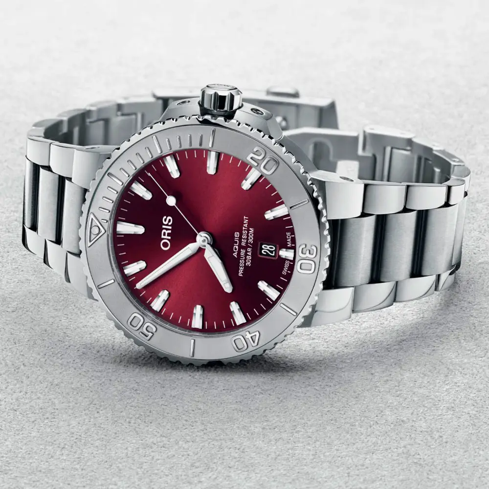 具备 300 米(30 巴)防水性能,搭配 不锈钢表链 与 安全折叠表扣,Oris Aquis Date Cherry Edition 诠释了 力量、独立与优雅 —— 将专业潜水性能与鲜明个性完美融合。
