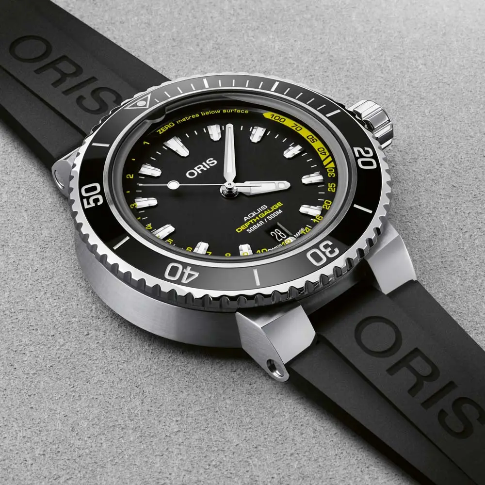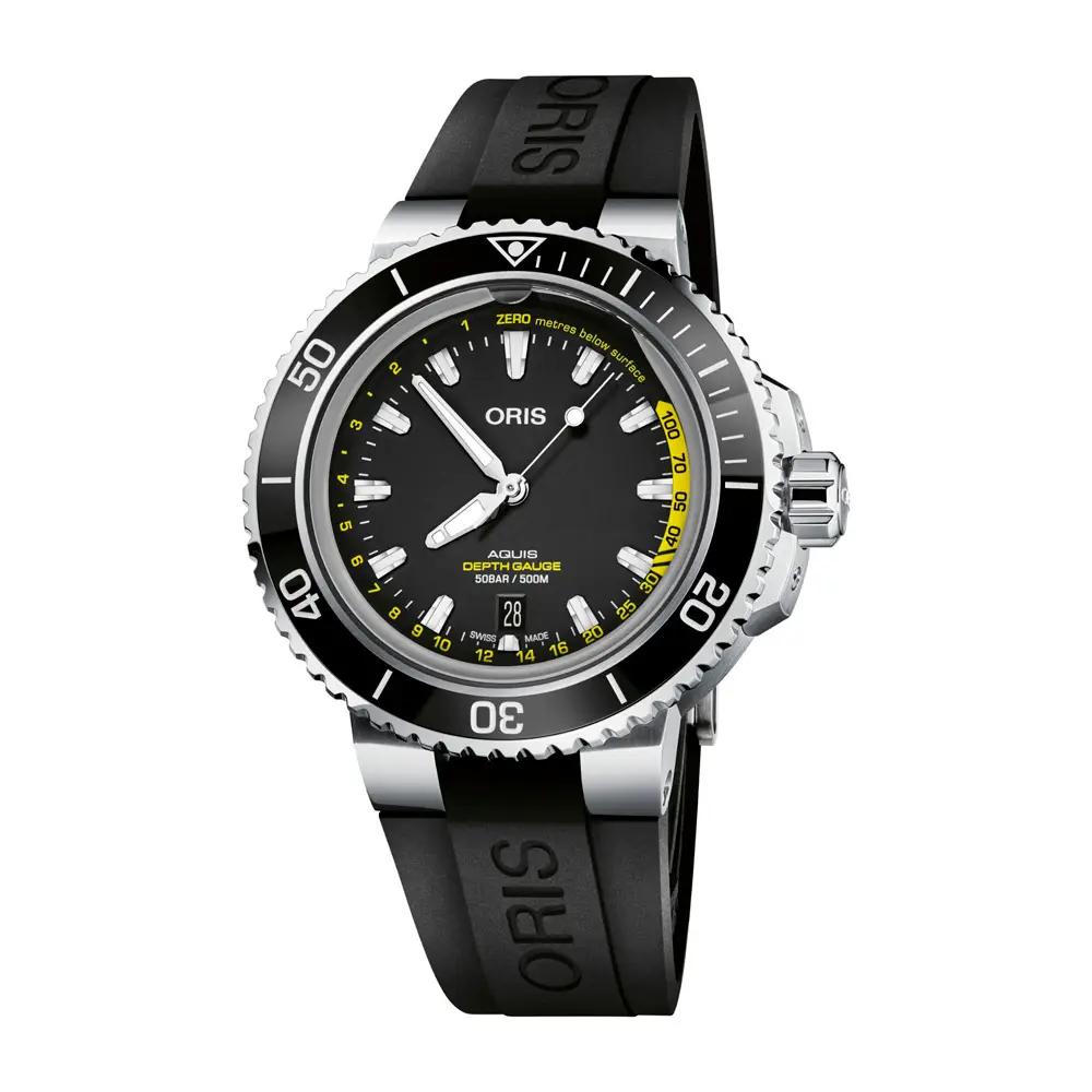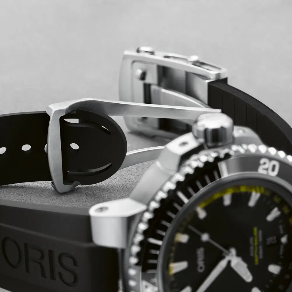配备 黑色橡胶表带 和 带延展系统的安全折叠表扣,可轻松佩戴于潜水服外。Oris Aquis Depth Gauge 融合了 瑞士精准工艺、创新工程设计与坚固耐用性,堪称专业潜水员的理想伙伴。