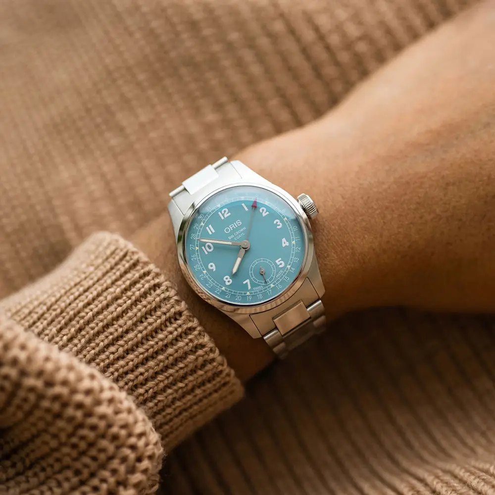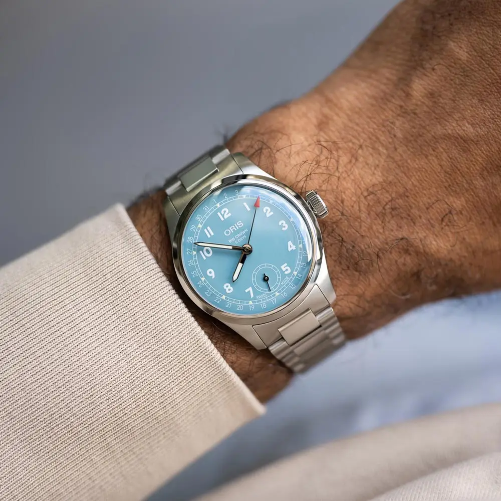Oris大表冠系列是品牌最具代表性的表款之一,于1938年推出,是专为飞行员设计的腕表。其独特之处在于大扇形表冠的设计,即使戴着手套也能轻松操作--这一细节依然彰显了该系列的航空渊源。