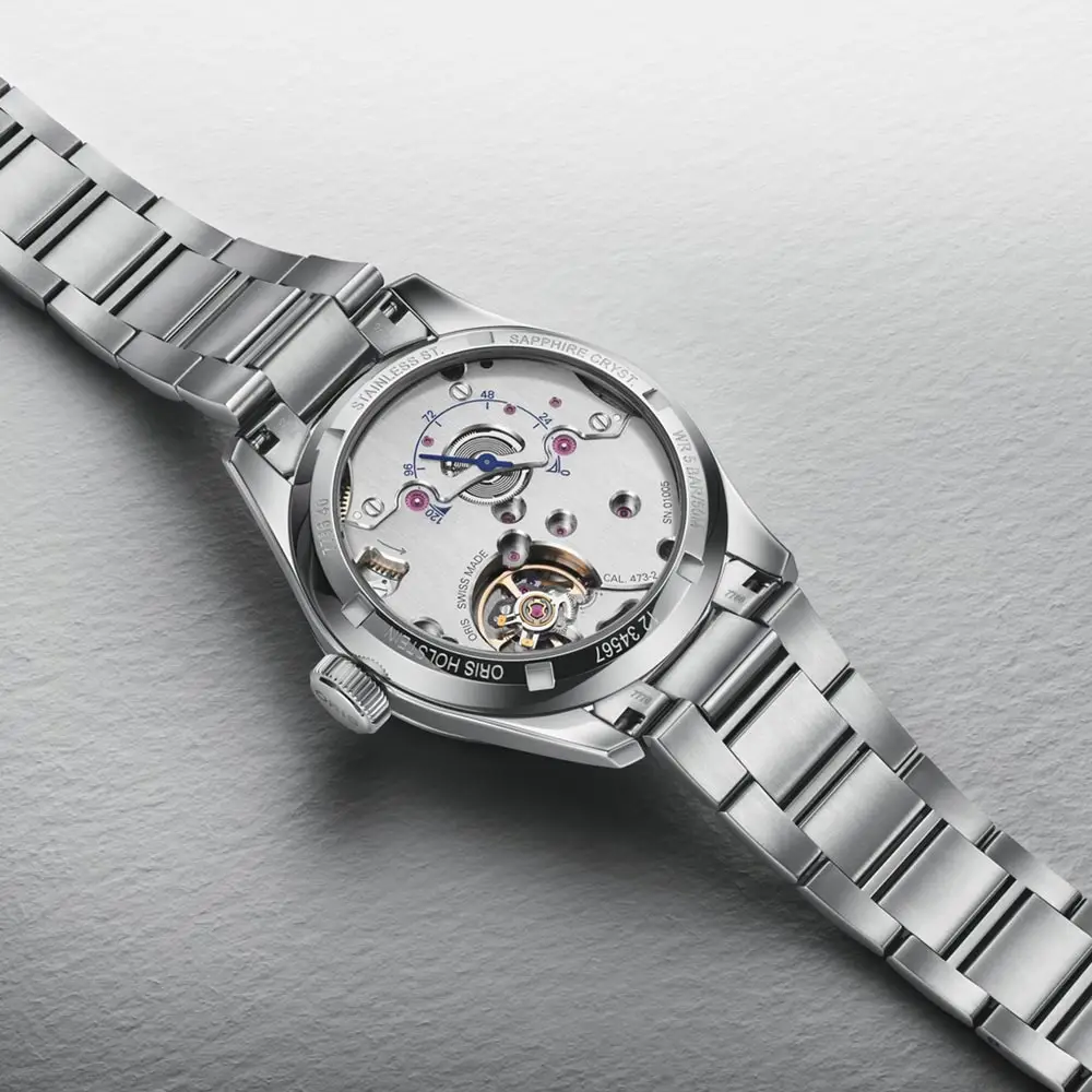 搭载自制机芯Oris 473,为手动上链,动力储存长达120小时(5天),振频28,800次/小时(4Hz),并带有动力储存显示。机芯耐用可靠,提供10年保修。