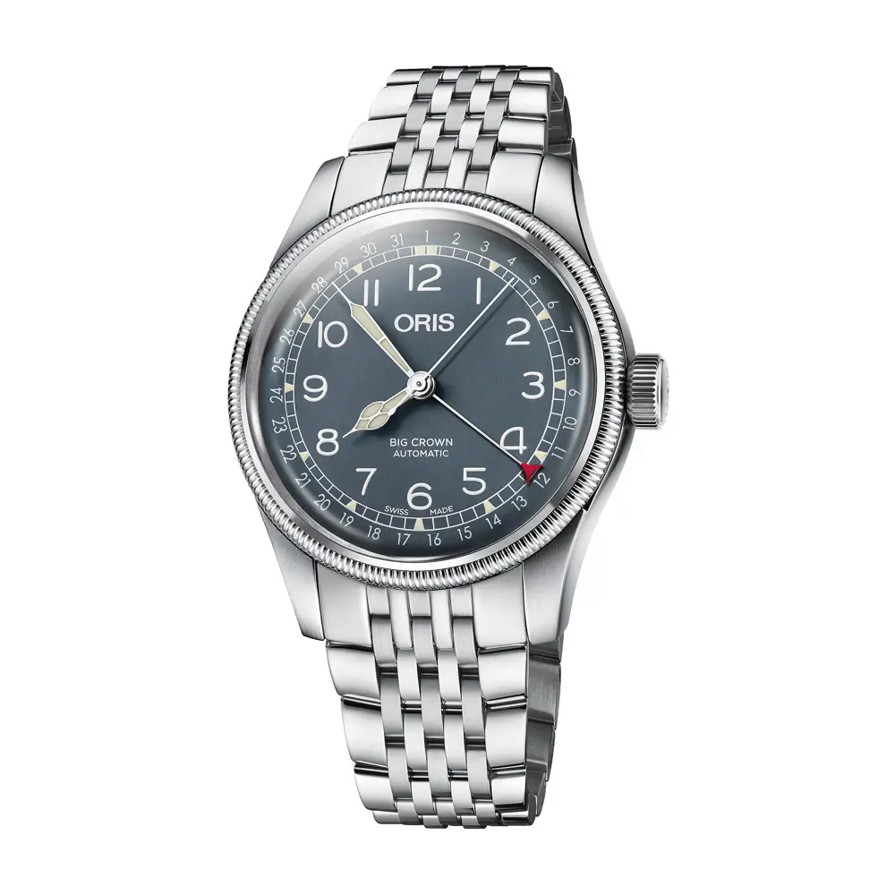 Oris Big Crown Pointer Date 01 754 7741 4065-07 8 20 22 是 Oris 标志性飞行员腕表的现代诠释,融合了 经典优雅、航空传承与瑞士机械精密工艺。腕表采用 40 毫米精钢表壳,搭配 灰色纹理表盘、夜光指针与阿拉伯数字时标,展现出 Oris 飞行员系列独有的复古气质。双面防眩光蓝宝石镜面 提供卓越的可读性。