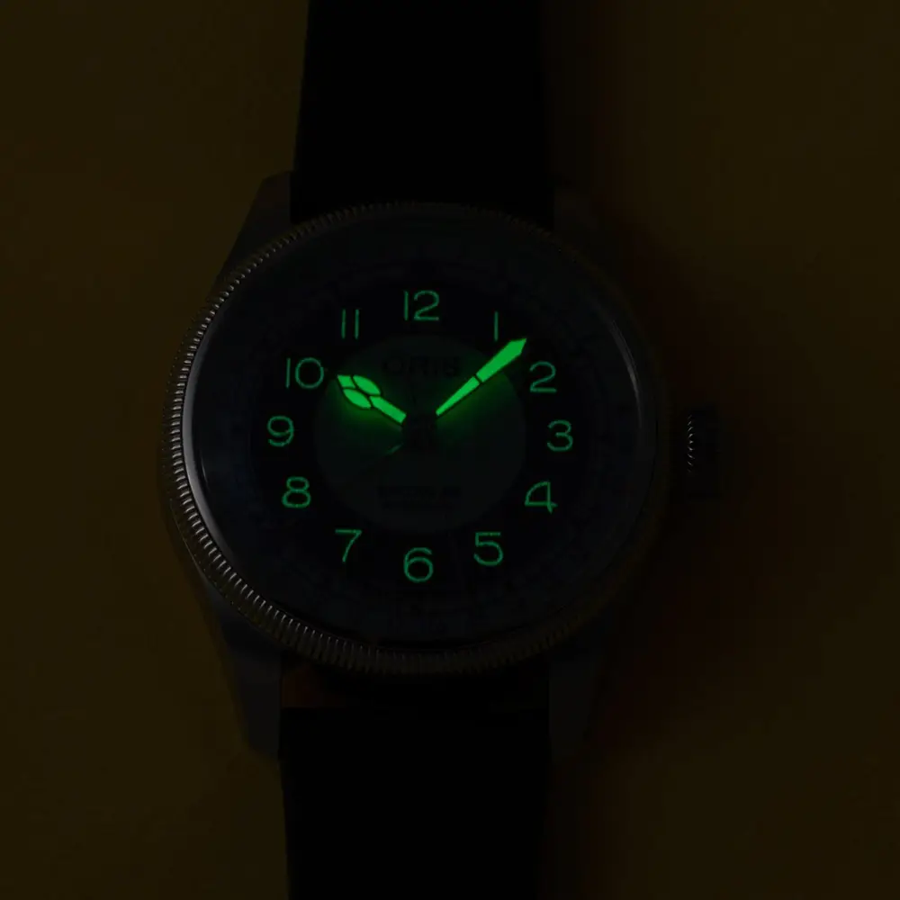 独特的Bullseye 风格表盘赋予腕表鲜明个性,将复古灵感与现代美学融为一体。该型号的代表性特征是Pointer Date 中央指针式日期显示,是 Oris 最具辨识度的功能之一。指针与时标覆有 Super-LumiNova® 夜光涂层,在弱光条件下依然清晰可见,5 bar(50 米)防水性能满足日常佩戴需求。