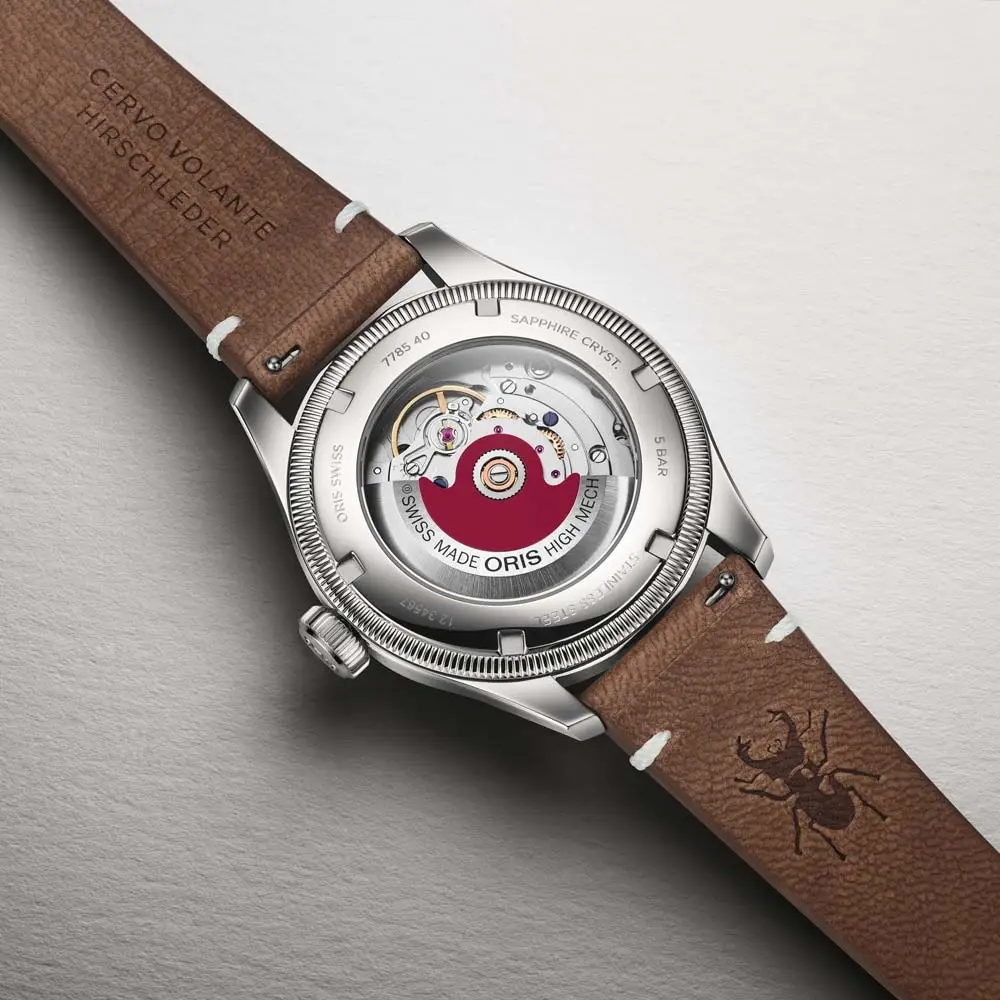 该型号与瑞士品牌 Cervo Volante 合作推出,该品牌以使用可持续来源的鹿皮制作配件而闻名。腕表搭配 桃花心木色鹿皮表带,佩戴舒适并具有自然质感。凭借 5 ATM / 50 m 防水性能、可靠机械机芯以及经典设计,适合日常佩戴及正式场合。