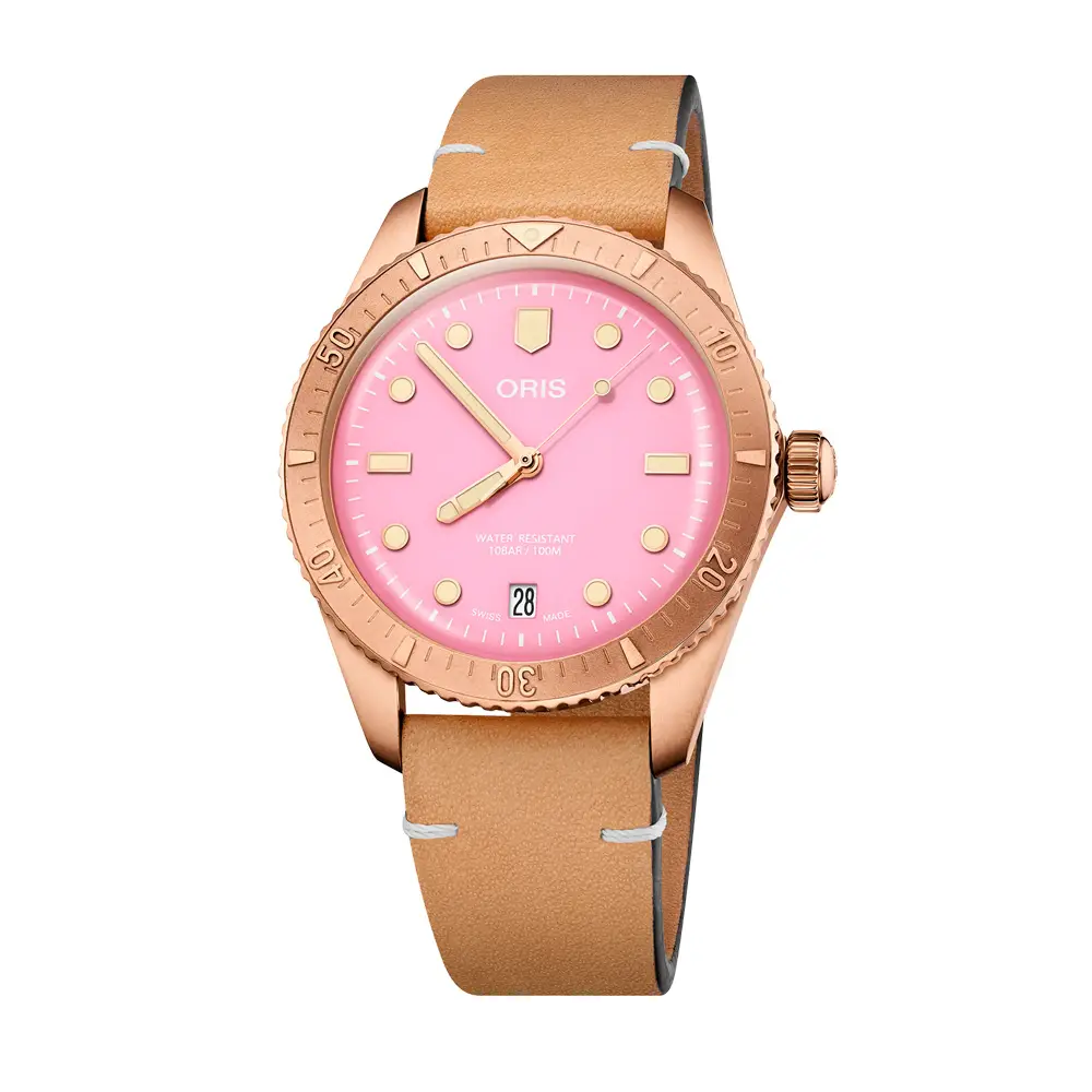 具备 100 米(10 巴)防水性能,搭配 棕色皮表带,Oris Divers Sixty-Five Bronze & Green Edition 诠释了 复古精神、机械卓越与现代优雅 的完美结合 —— 专为追求个性与品质的鉴赏家而设计。