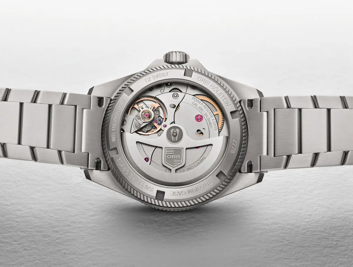 腕表搭载自制 Oris Calibre 400 自动机芯,提供 长达 120 小时(5 天)动力储备,具备卓越抗磁性能与精准走时表现。凭借先进结构,Oris 提供 注册后 10 年保修服务。该款腕表 防水深度达 100 米(10 巴),兼顾日常佩戴与户外活动。