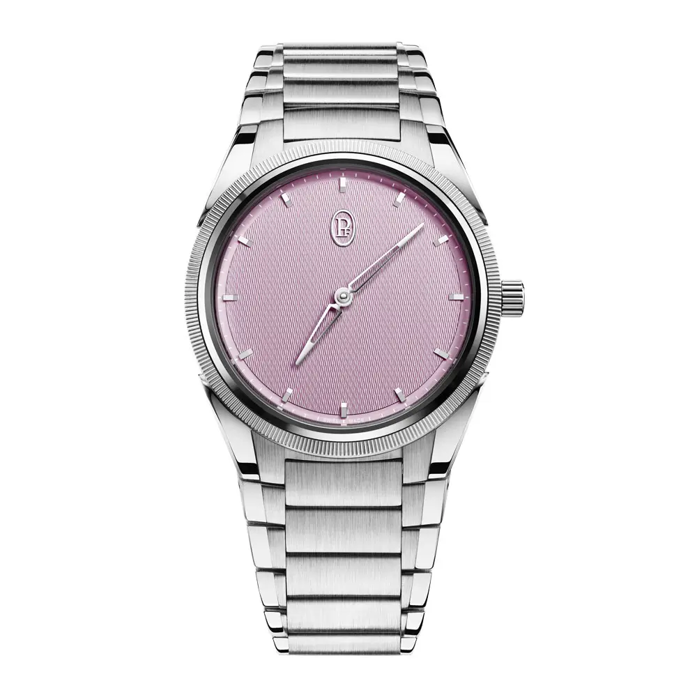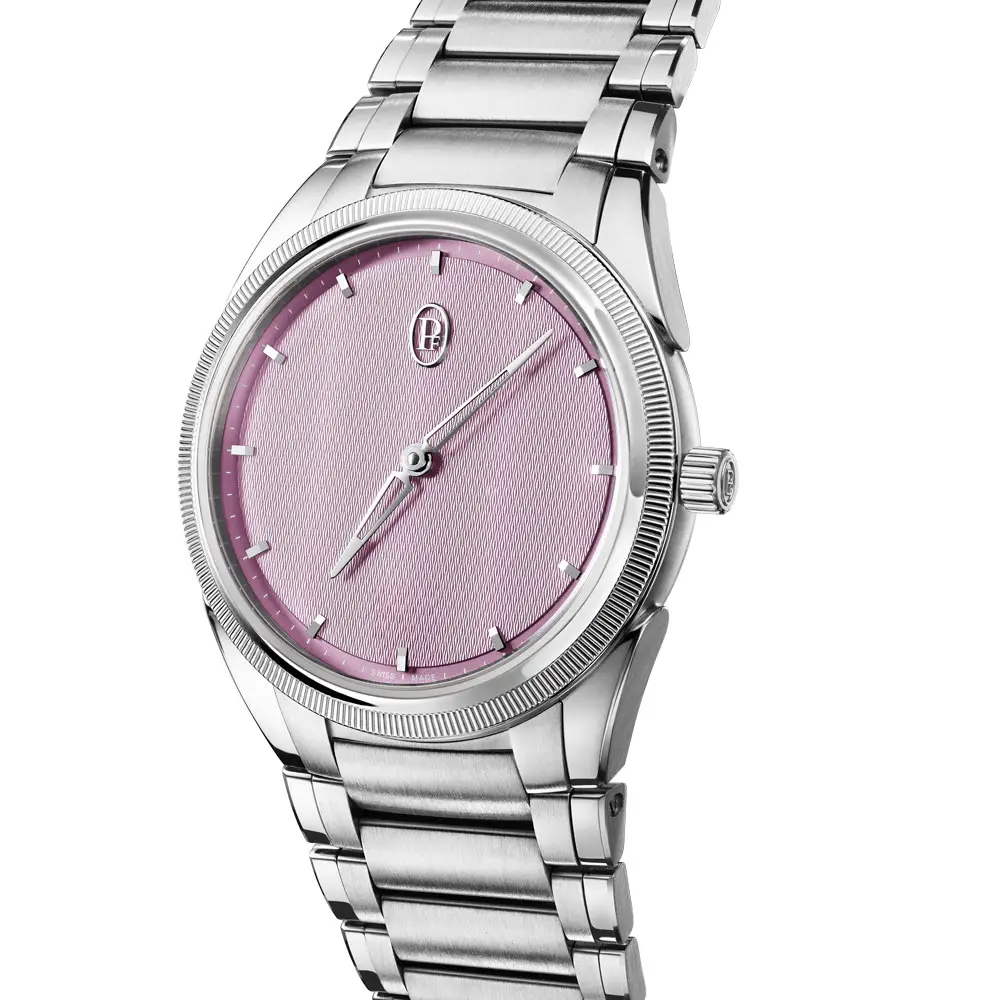 帕玛强尼 Tonda PF 自动腕表(Alta Rosa)采用优雅简约设计,适合日常佩戴。表壳为不锈钢搭配950铂金表圈,直径36毫米,厚度8.6毫米,防水100米。Alta Rosa表盘带有手工雕刻纹理和18K金时标,风格柔和精致。