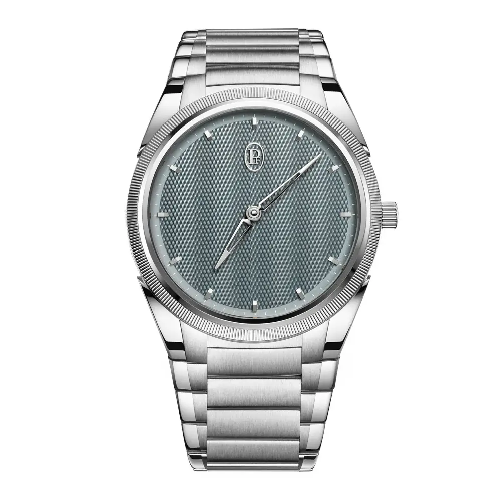 帕玛强尼 Tonda PF 微型摆陀无日期腕表(Agave Blue)结合了简约设计与高级制表工艺。表壳采用不锈钢搭配950铂金表圈,直径40毫米,厚度7.8毫米,防水100米。Agave Blue表盘带有手工雕刻纹理和18K金时标,外观低调优雅。