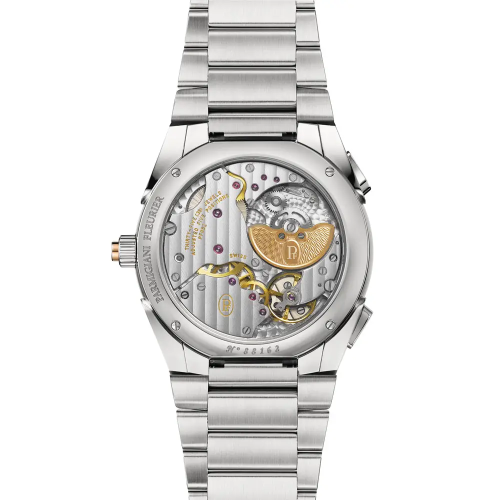 机芯内部搭载自制 PF052 自动上链机芯,动力储备 48 小时,22K 金微转子,防水深度 60 米。该表款是追求高端机械、新颖复杂功能和低调奢华的现代设计人士的理想选择。