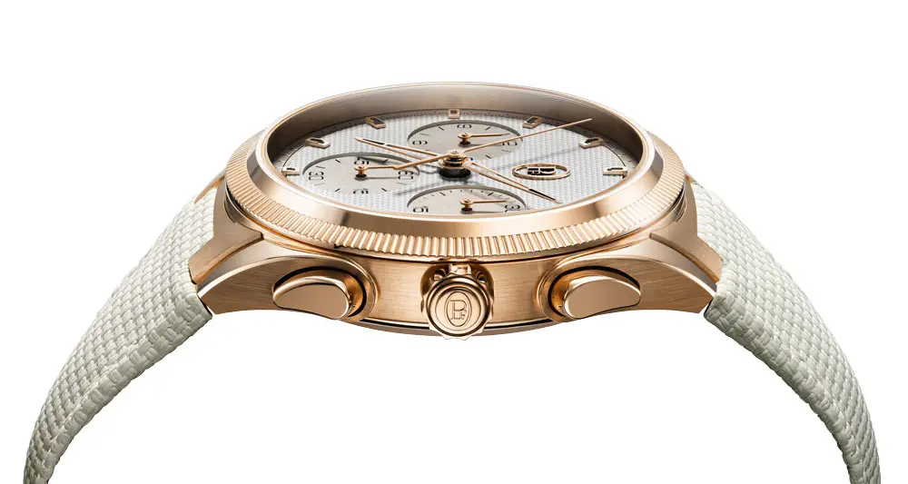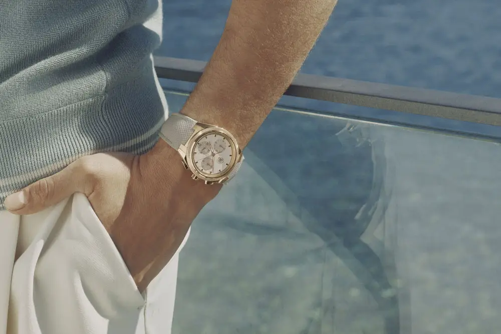 Parmigiani Fleurier Tonda PF Sport Chronograph 采用 18K玫瑰金 精制而成,结合了运动风格与高级制表工艺。42毫米表壳 配备手工雕刻表圈,与沙色表盘和三眼计时盘相得益彰,搭配夜光三角指针。