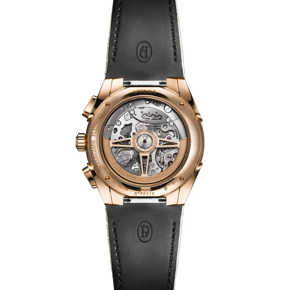 腕表搭载自动上链 PF070 机芯,具备计时功能,65小时动力储存,机芯通过蓝宝石背透可欣赏到精美打磨。高频 36,000次/小时 提供卓越精准度。