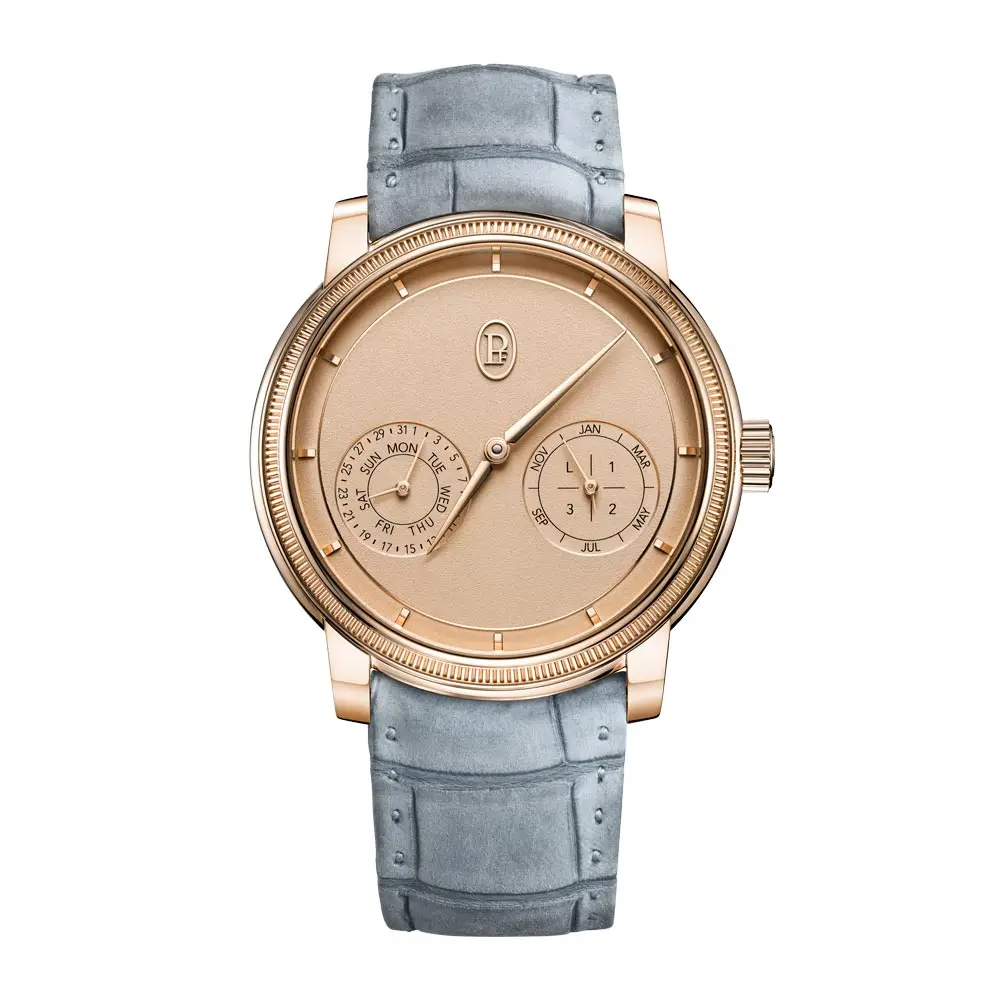 腕表搭载自制 PF733 手动上链机芯,由 265 个零件 和 29 颗宝石组成。振频 4 Hz,动力储备 60 小时。万年历功能包括 日期、星期、月份和闰年,优雅布局于 两个小表盘(4 点与 8 点位置),确保平衡与易读性。