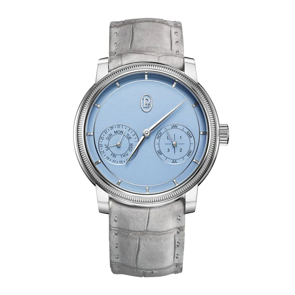 腕表搭载自制 PF733 手动上链机芯,由 265 个零件 和 29 颗宝石 组成。振频 4 Hz,动力储备 60 小时。万年历 功能显示 星期、日期、月份和闰年,优雅布局于 两个小表盘,确保完美易读性。