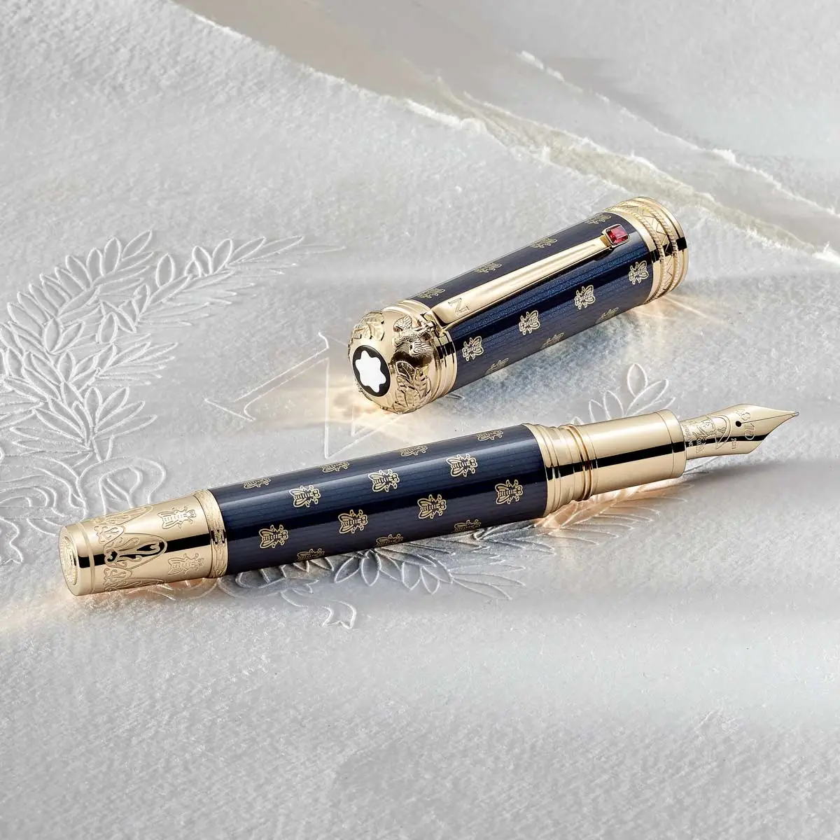 | 笔身 | 深色特殊蓝漆上的金色蜜蜂图案,部分镀金,灵感来自制服和拿破仑王座,蜜蜂图案象征着与波旁王朝的背离,并指代法国墨洛温王朝。镀金雕刻的锥形手柄上有埃及图案 |