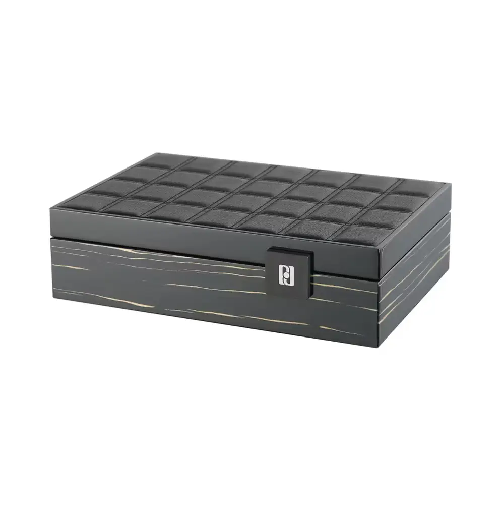 这款 Paul Design Collector 10 手表盒是用于安全且优雅地存放多达 十枚手表 的理想之选。由优质木材制成,提供多种精致外观选择,如 Black Shadow、Black Apricot 和 Macassar,其五层高光漆面展现出非凡工艺与耐用美感。内部采用柔软的黑色天鹅绒衬里,保护手表免受刮擦,并配有镀铬铰链和可上锁的盖子。