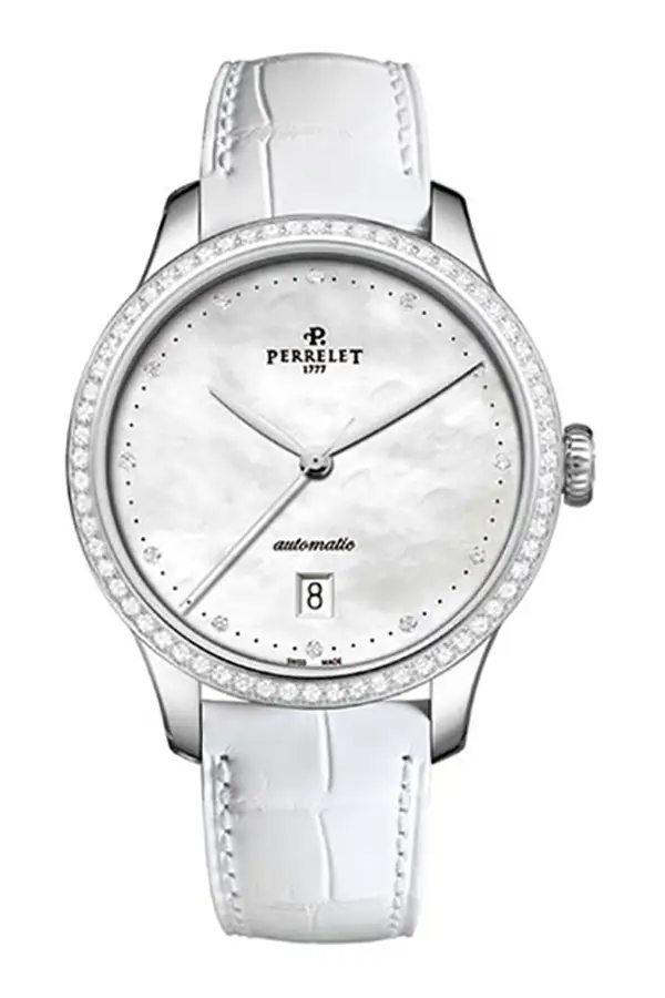 作为 First Class 系列的一部分,Perrelet 女装腕表以其优雅精致的做工为特色,完美体现了女性敏感温柔的灵魂。表盘镶嵌在精钢表壳中,配备日期显示和镶钻模拟表盘。月牙形表盘上也镶有钻石,与白色真皮表带相得益彰。