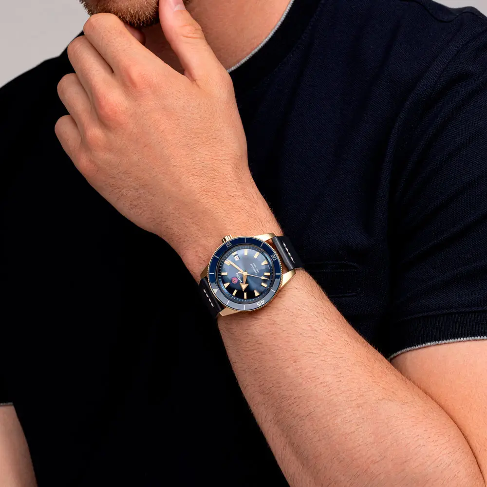 Rado Captain Cook Automatic Bronze R32504205 将 经典潜水表风格与现代瑞士制表工艺 完美融合。其 42 毫米 CuAl 青铜表壳 随时间自然形成独特色泽,使每枚腕表都独一无二。深蓝色表盘 搭配 镀金夜光指针与时标,并配有 高科技陶瓷旋转表圈,兼具优雅与运动气息。