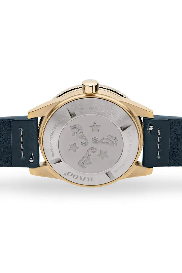 配备 蓝色皮革表带,采用 EasyClip 快拆系统,更换便捷。Rado Captain Cook Automatic Bronze R32504205 融合了 冒险精神、精准工艺与永恒设计,是追求优雅与力量平衡的现代男士理想之选。