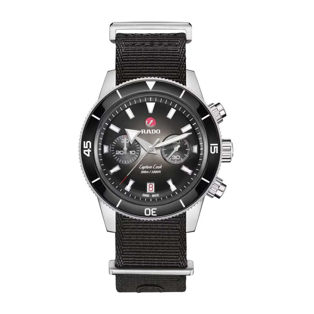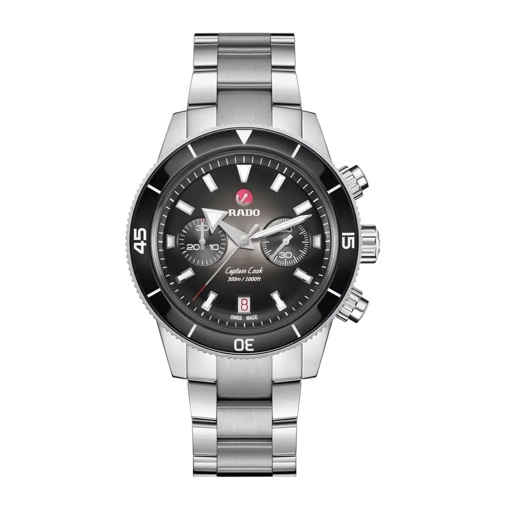 Rado Captain Cook Automatic Chronograph R32145158 将 坚固的运动风格与先进的计时功能 完美结合。腕表采用 43 毫米不锈钢表壳,配有 黑色高科技陶瓷表圈嵌件 和 防反光盒形蓝宝石水晶镜面,兼具耐磨与清晰度。