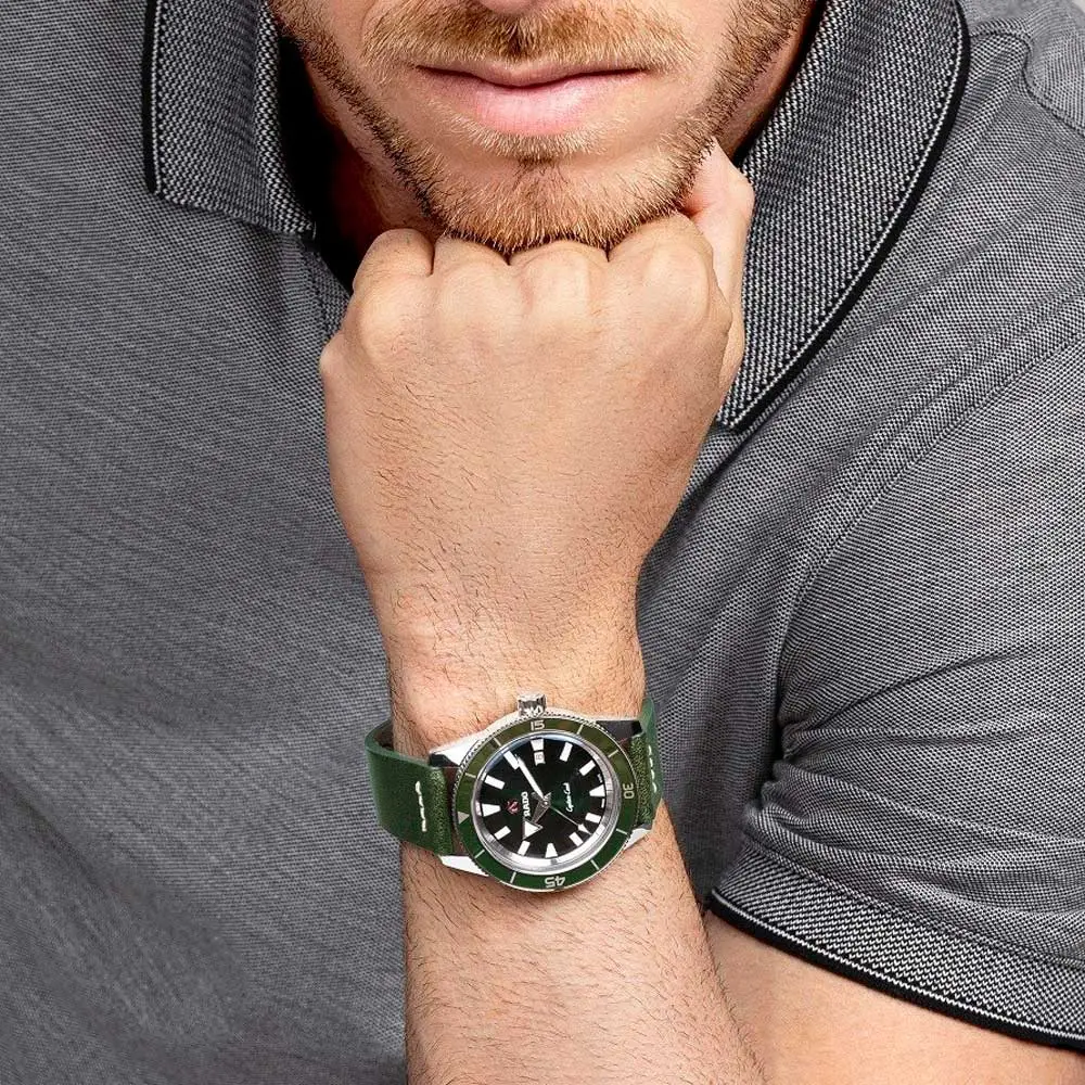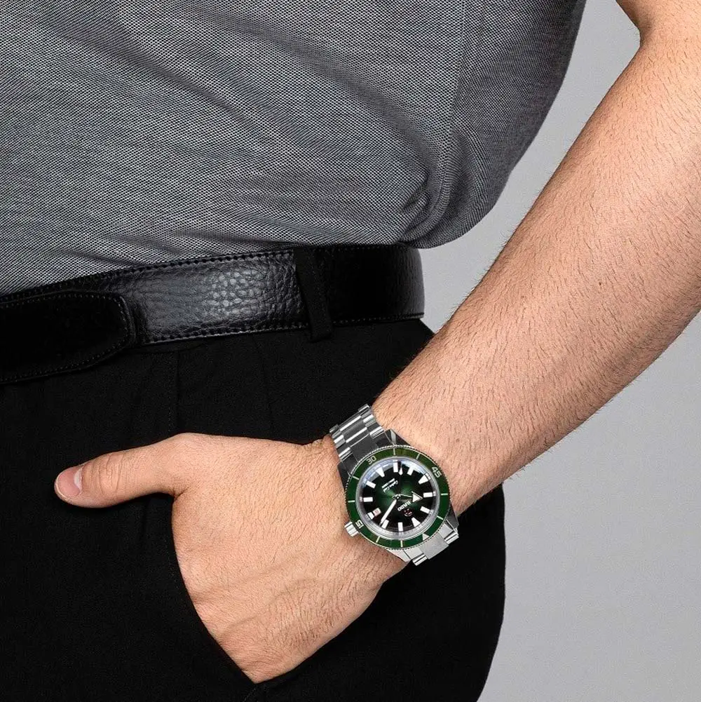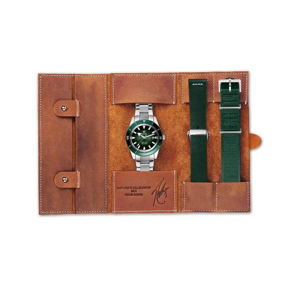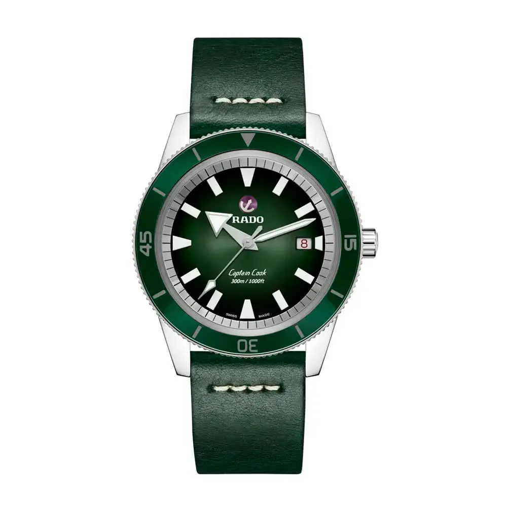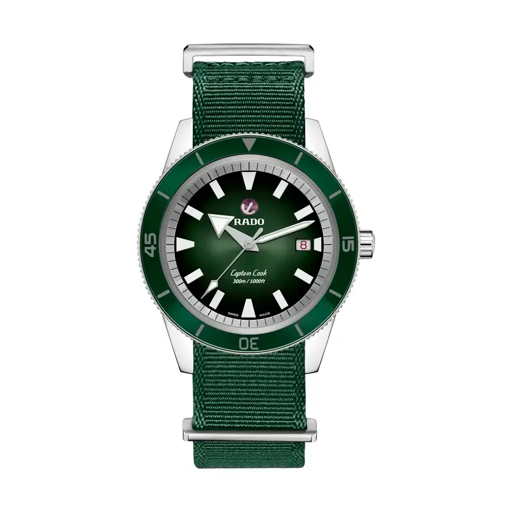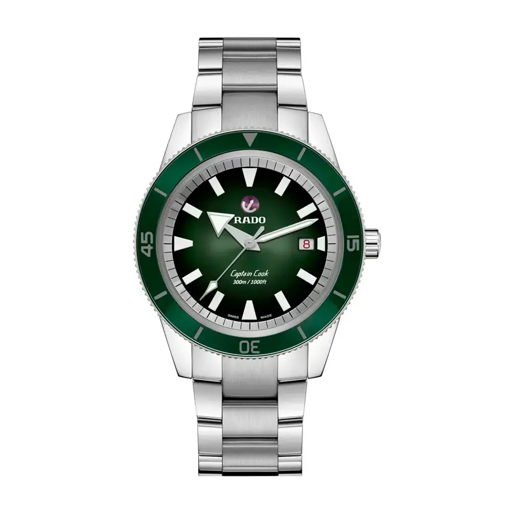 Rado Captain Cook Automatic Hrithik Roshan Special Edition R32105319 是与 Rado 品牌大使、宝莱坞影星 Hrithik Roshan 合作推出的特别版潜水腕表。腕表采用 42 毫米不锈钢表壳,搭配 绿色高科技陶瓷表圈,与优雅的 绿色表盘 相互呼应。夜光指针和时标 确保清晰读时,防反光蓝宝石水晶镜面 提供卓越保护。