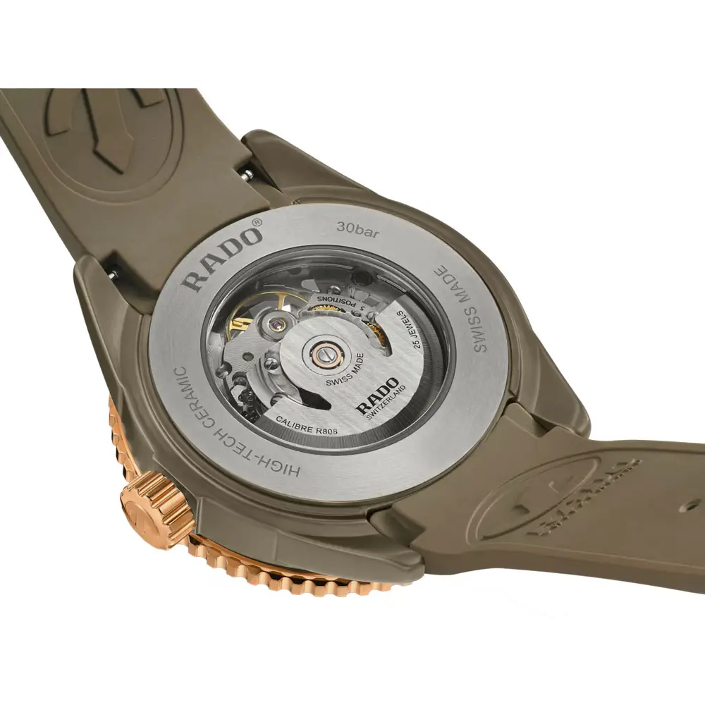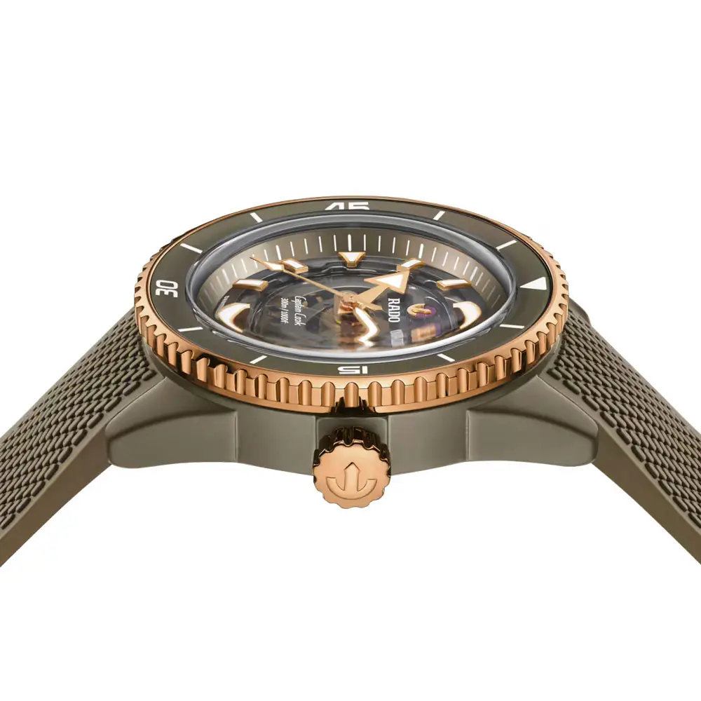 Rado Captain Cook High-Tech Ceramic Skeleton(型号 R32150168)融合经典潜水表设计与现代材质。43毫米橄榄绿色高科技陶瓷表壳轻盈且耐刮。玫瑰金色旋转表圈(陶瓷嵌件)、旋入式表冠以及300米防水(30 ATM),满足专业潜水需求。