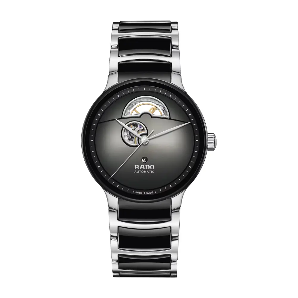 Rado Centrix Automatic Open Heart R30012152 是一款将优雅设计与精湛瑞士制表工艺完美融合的豪华男士腕表。直径 39.5 毫米的不锈钢圆形表壳搭配陶瓷表圈,赋予腕表现代感和出色的防刮性能。灰色镂空表盘展现部分自动上链机械机芯,动力储存约 80 小时。