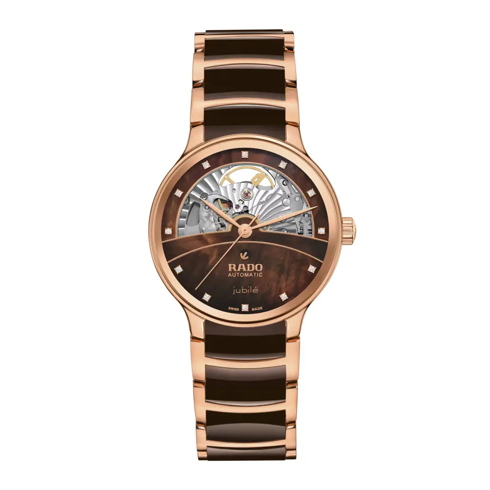 Rado Centrix Automatic Diamonds Open Heart R30029902 是技术精湛与优雅设计的完美结合,专为欣赏精密制表艺术的女性打造。腕表采用 直径为 35 毫米的圆形表壳,由 玫瑰金色涂层的不锈钢 制成,并配有 双色陶瓷与钢制表链,展现出非凡的精致美感。