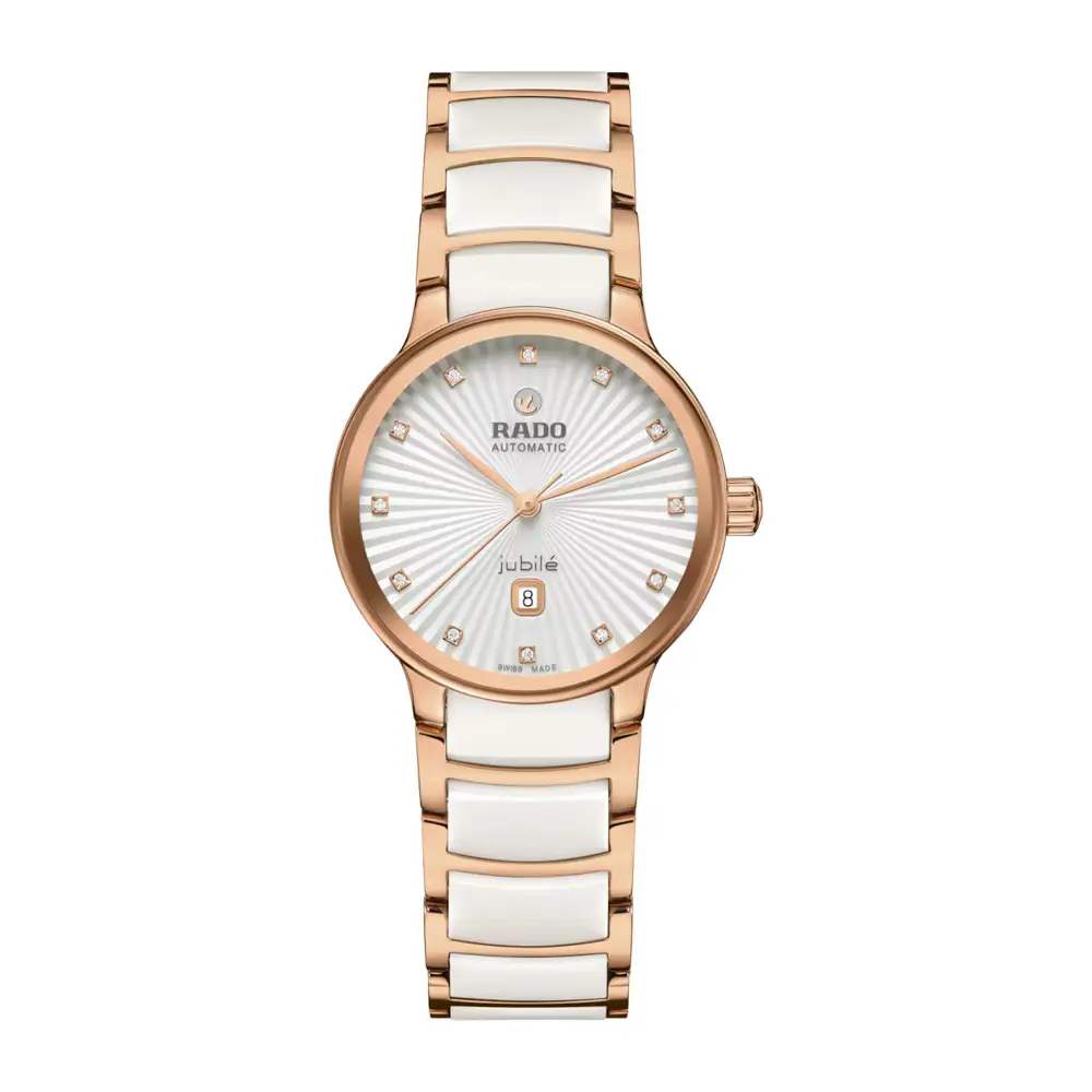 Rado Centrix Automatic Diamonds(型号 R30019744)是一款融合优雅设计与瑞士精准工艺的女士腕表。30.5毫米不锈钢表壳(玫瑰金PVD镀层)呈现精致外观。配备弧形防反射蓝宝石玻璃与人体工学设计,防水性能达 50米(5 ATM)。
