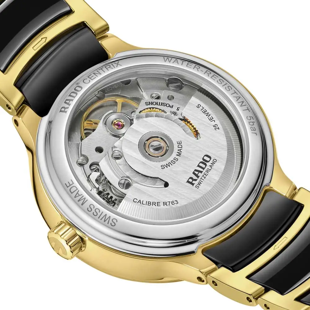 Rado Centrix Automatic Diamonds R30032742 诠释了 奢华、瑞士精准与女性优雅 的完美融合。腕表来自 Centrix 系列,采用 精钢与玫瑰金 PVD 镀层 的组合设计,兼具现代感与永恒气质。30.5 毫米表壳 与 一体式精钢陶瓷表链 无缝衔接,展现出 Rado 标志性的流畅线条。