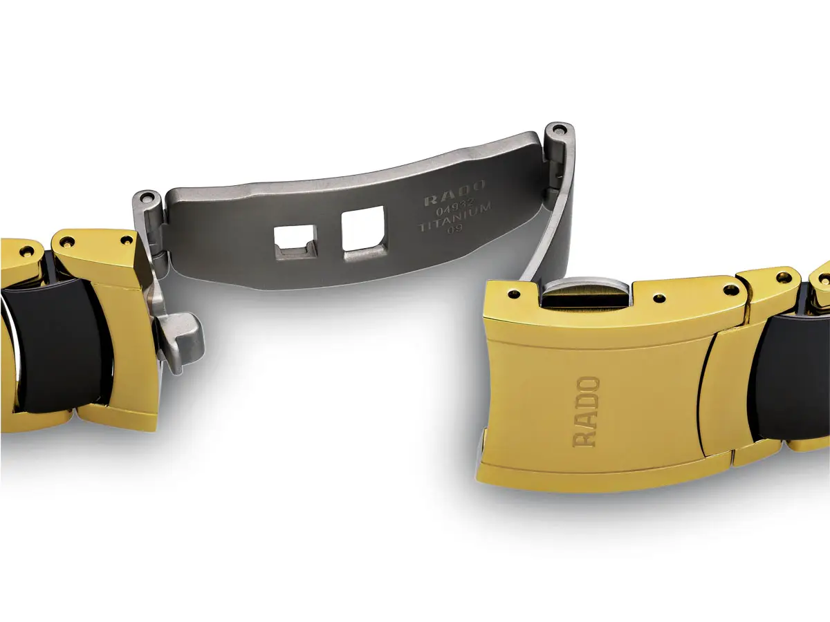 表链由 陶瓷、不锈钢与镀金材质组合而成,展现亮眼的 双色设计,并配备 折叠式表扣,佩戴舒适且安全。内部搭载 自动上链机械机芯,无需更换电池也能保持 精准走时。