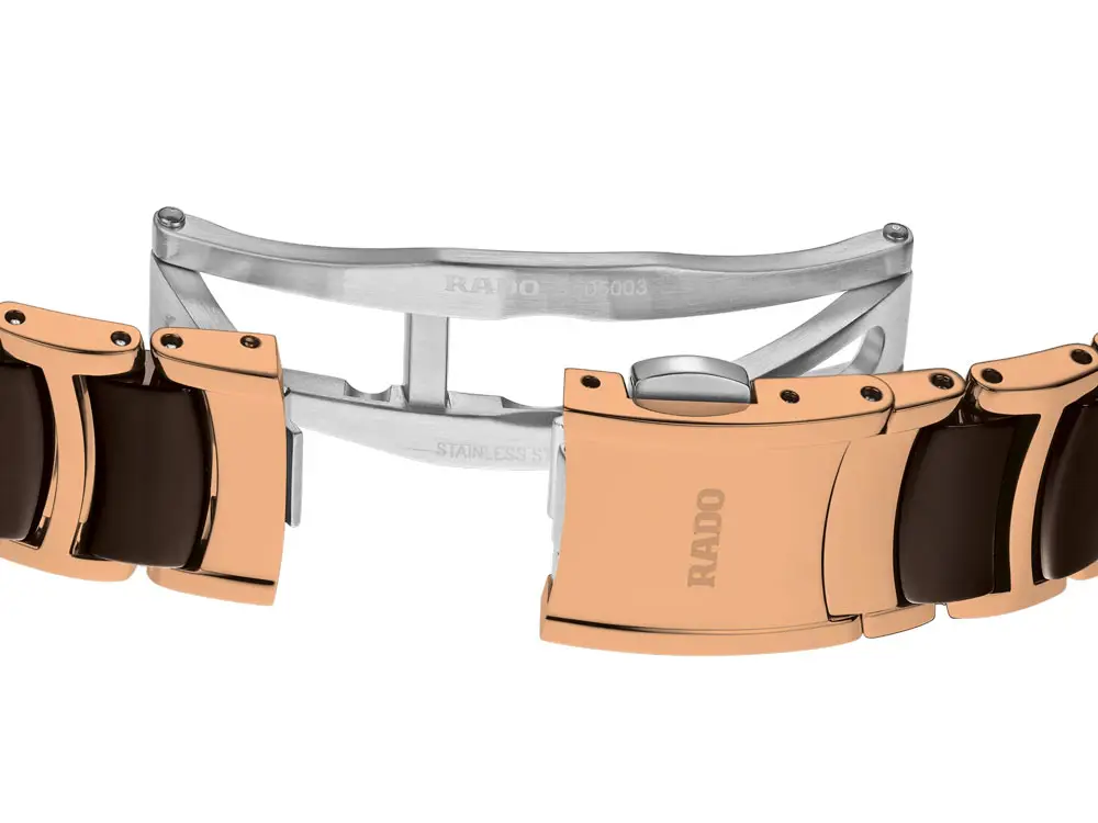 不锈钢表链 搭配 玫瑰金陶瓷链节,完美融合美感与舒适度。Rado Centrix R30024302 代表 现代奢华、瑞士制表工艺与优雅多功能性,是每个场合的理想之选。