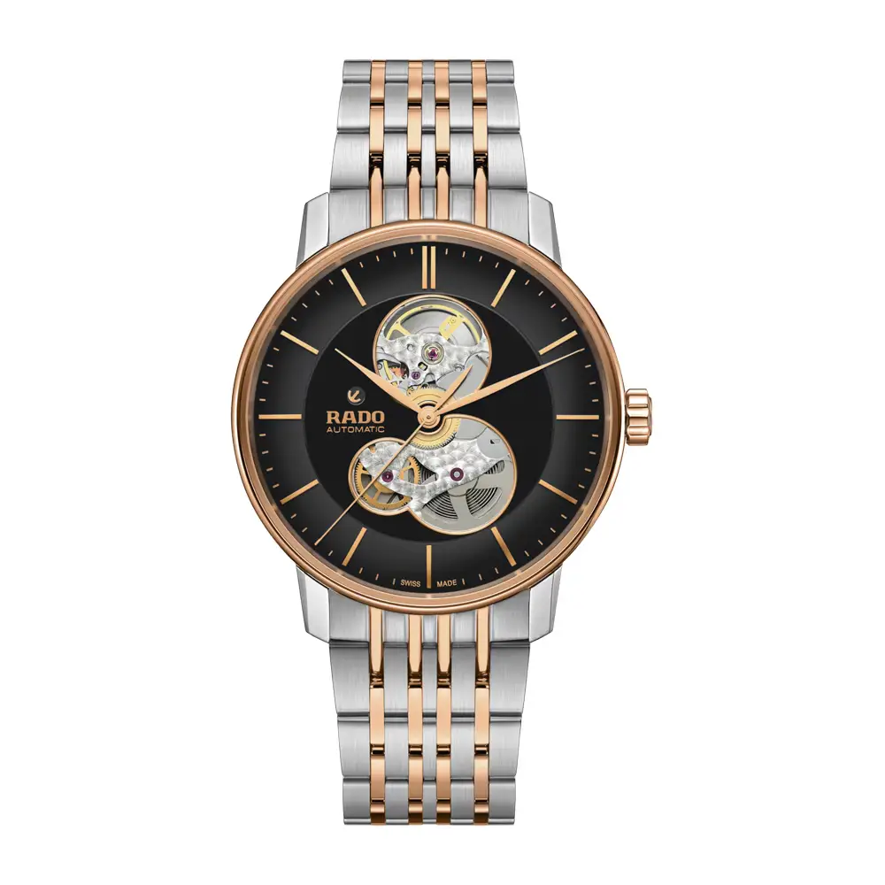 不锈钢与玫瑰金 PVD 双色表链 与整体设计完美融合,佩戴舒适自然。Rado Coupole Classic Open Heart R22894163 代表着永恒的优雅与瑞士精湛工艺,是追求传统与创新平衡的男士理想之选。