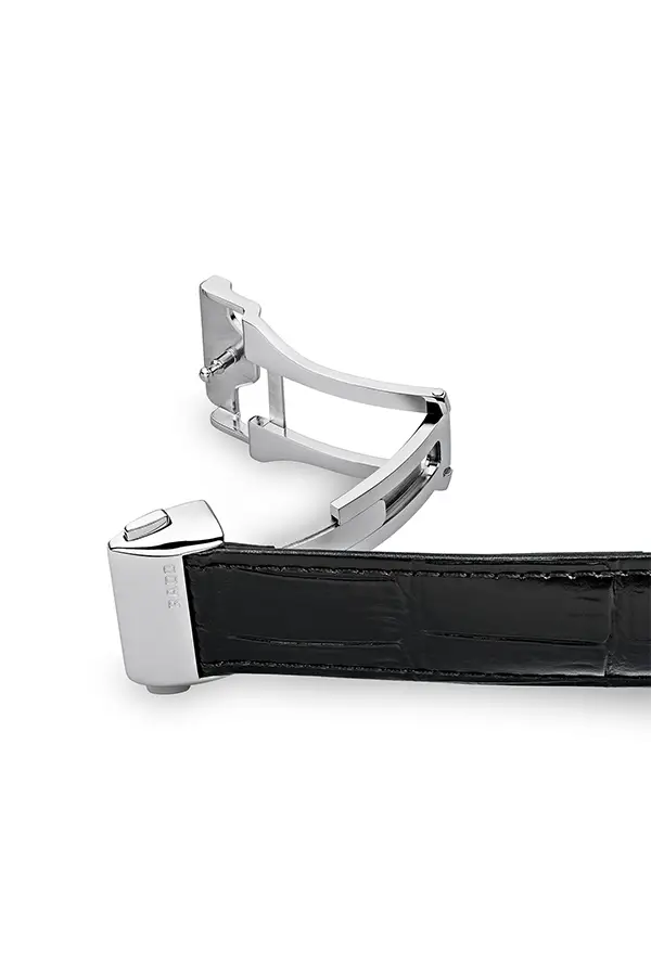 黑色真皮表带搭配折叠式表扣,佩戴舒适,并与浅色表盘形成优雅对比。防水性能达 50 米(5 ATM),适合日常佩戴。内部搭载精准石英机芯,提供高可靠性且几乎无需维护。