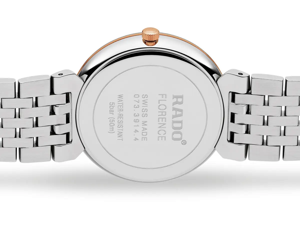 具备 50 米(5 巴)防水性能,Rado Florence Classic Diamonds R48912723 无论日常佩戴或正式场合皆相宜。它象征着 女性魅力、瑞士工艺与永恒优雅 —— 是女士腕表中的璀璨珍品。