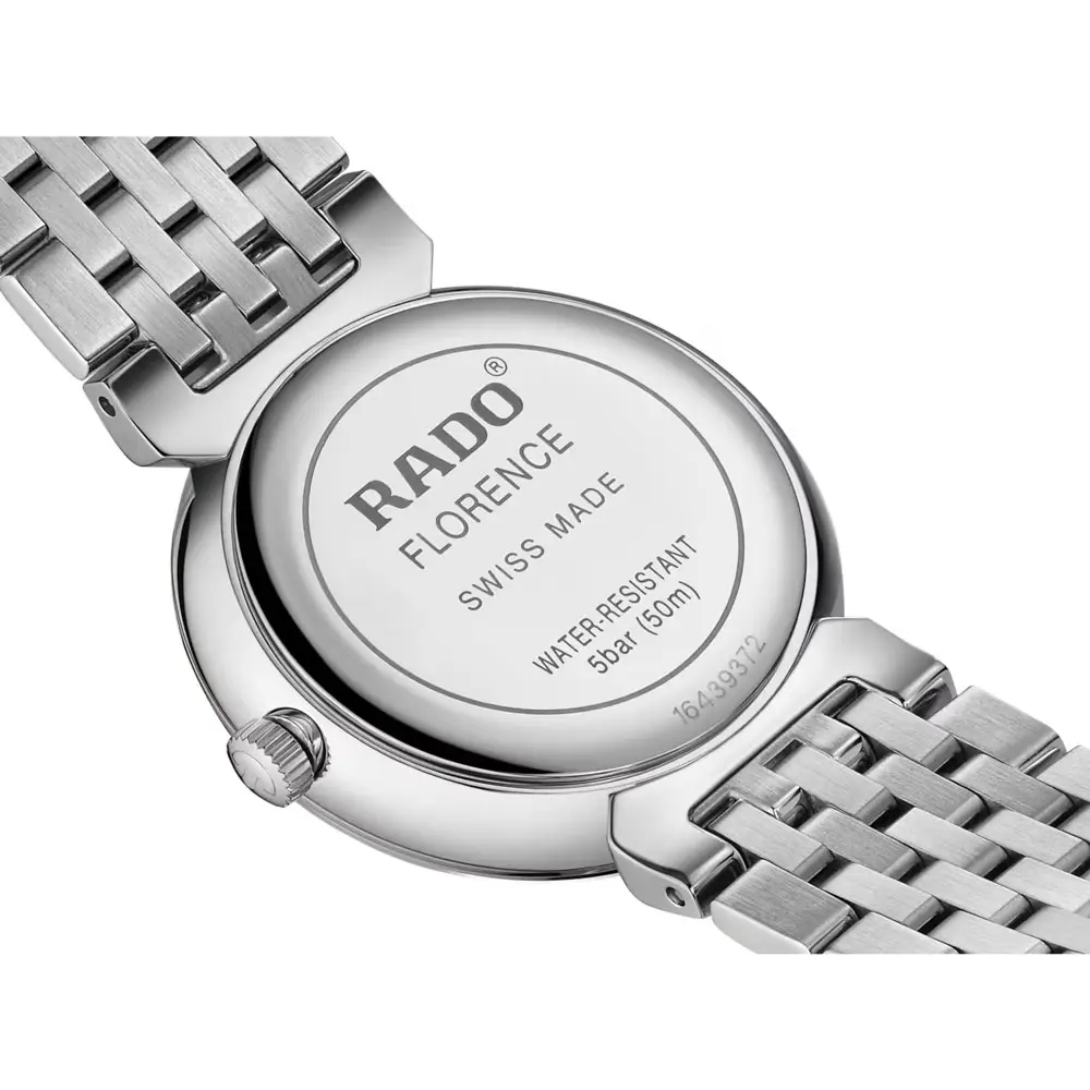 Rado Florence Diamonds R48913903体现了女性的优雅气质,灵感来自古典建筑。30 毫米表壳由抛光不锈钢制成,搭配弧形蓝宝石水晶玻璃表镜,与表壳线条浑然天成,同时确保了耐用性和精致度。
