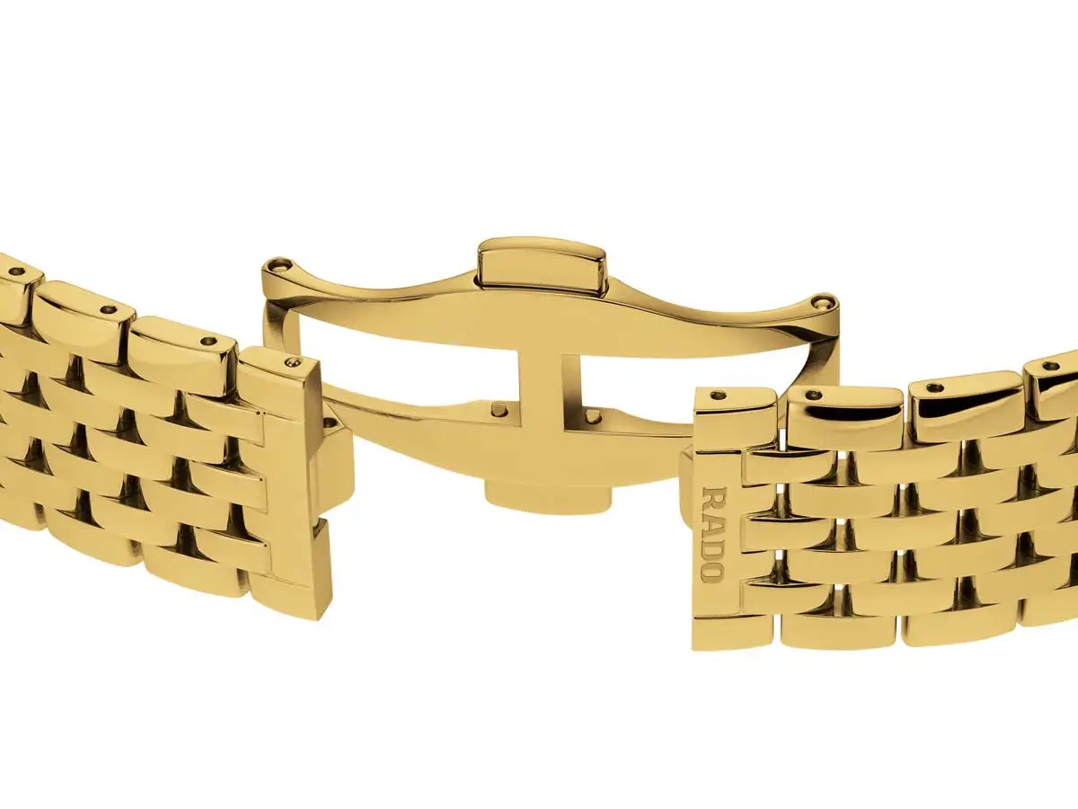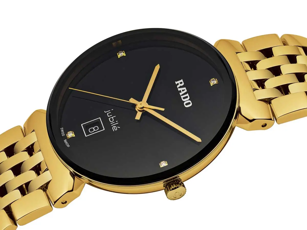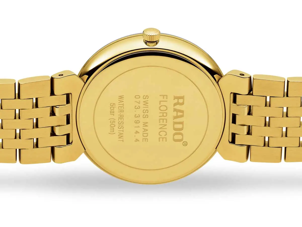 Rado Florence Diamonds R48914703 结合了经典优雅、精准工艺与奢华细节。38 毫米圆形表壳采用镀金不锈钢材质,与金色不锈钢表链完美搭配。整体设计协调统一,黑色表盘镶嵌钻石时标,彰显尊贵气质。