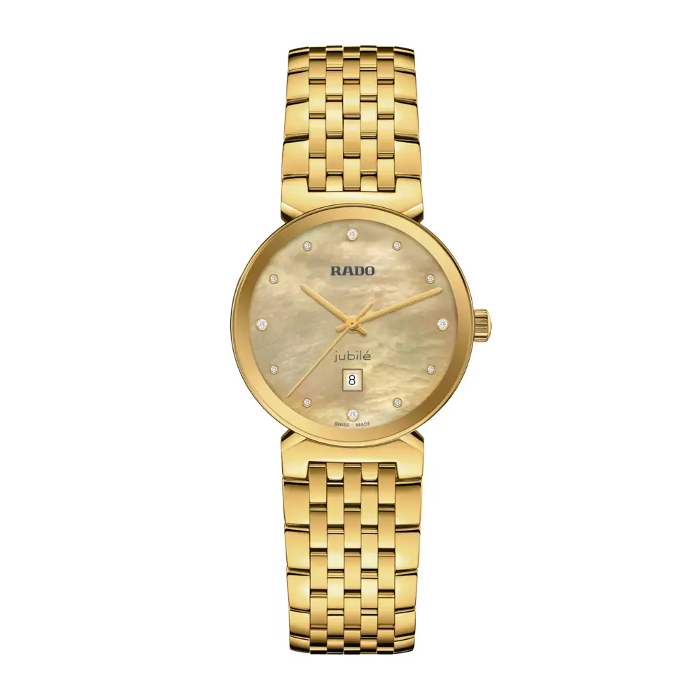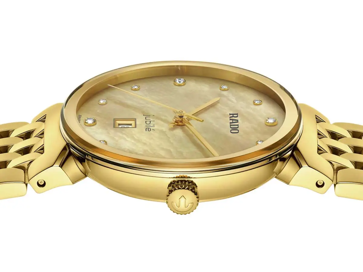 Rado Florence Diamonds R48915903 将 优雅、女性魅力与瑞士精准工艺 融为一体。腕表采用 30 毫米精钢表壳搭配黄色 PVD 镀层,与 同色精钢表链 无缝衔接,展现出平衡而精致的外观。珍珠母贝表盘饰以 12 颗钻石,闪耀柔美光彩,而 切面蓝宝石镜面 确保清晰读时并具备出色的防刮性能。