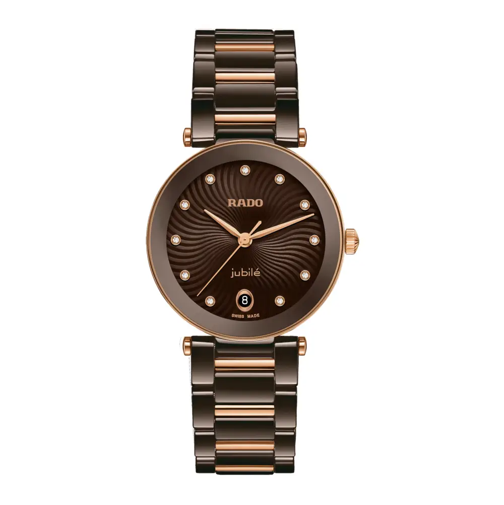 Rado La Coupole Diamonds R22242703 女士腕表融合了瑞士精准制表工艺与现代优雅。腕表采用31 毫米抛光棕色高科技陶瓷表壳,搭配玫瑰金色不锈钢表圈,展现出温润柔美的气质。