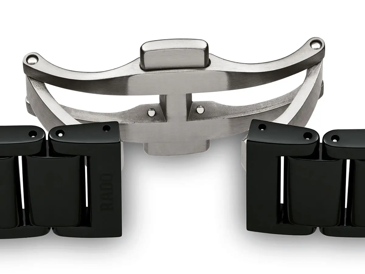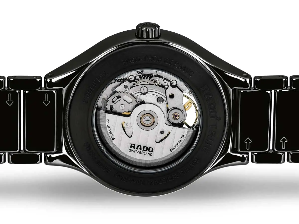一体化高科技陶瓷表链 与表壳浑然一体,透明底盖 展现自动陀的运转之美。Rado True Automatic Open Heart R27100162 代表了 瑞士创新、现代设计与制表艺术 的完美结合。