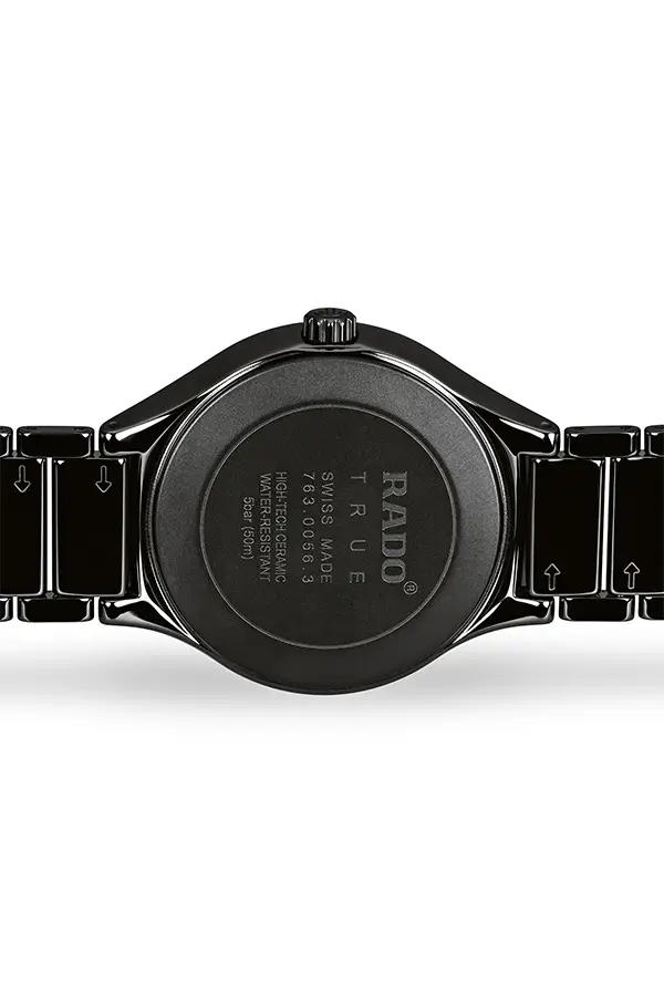 Rado True R27056722 体现了 现代优雅与瑞士制表工艺的完美结合。腕表采用 高科技陶瓷 材质,具有 轻盈、防过敏、抗刮擦 的特性。40 毫米圆形表壳 线条流畅,呈现优雅的哑光黑色,与 一体式陶瓷表链 无缝衔接,佩戴舒适。